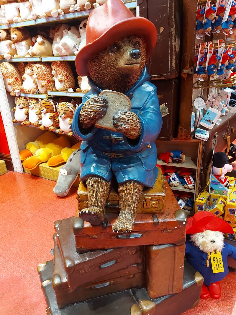 Paddington is eating his marmalade sandwich in the famous Hamleys' store in London